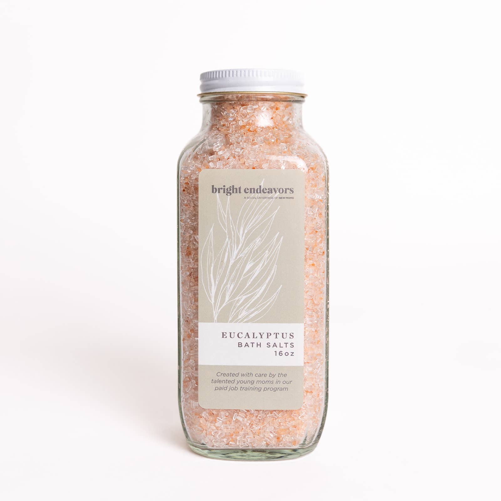 Our soaking salts were blended with care by the talented young moms in our paid job training program. Each salt contains a blend of Pink Himalayan and Epsom salts and comes in a recyclable 16 ounce glass jar. We recommend 2 tablespoons of salt per warm bath. Lasts 14-16 baths.