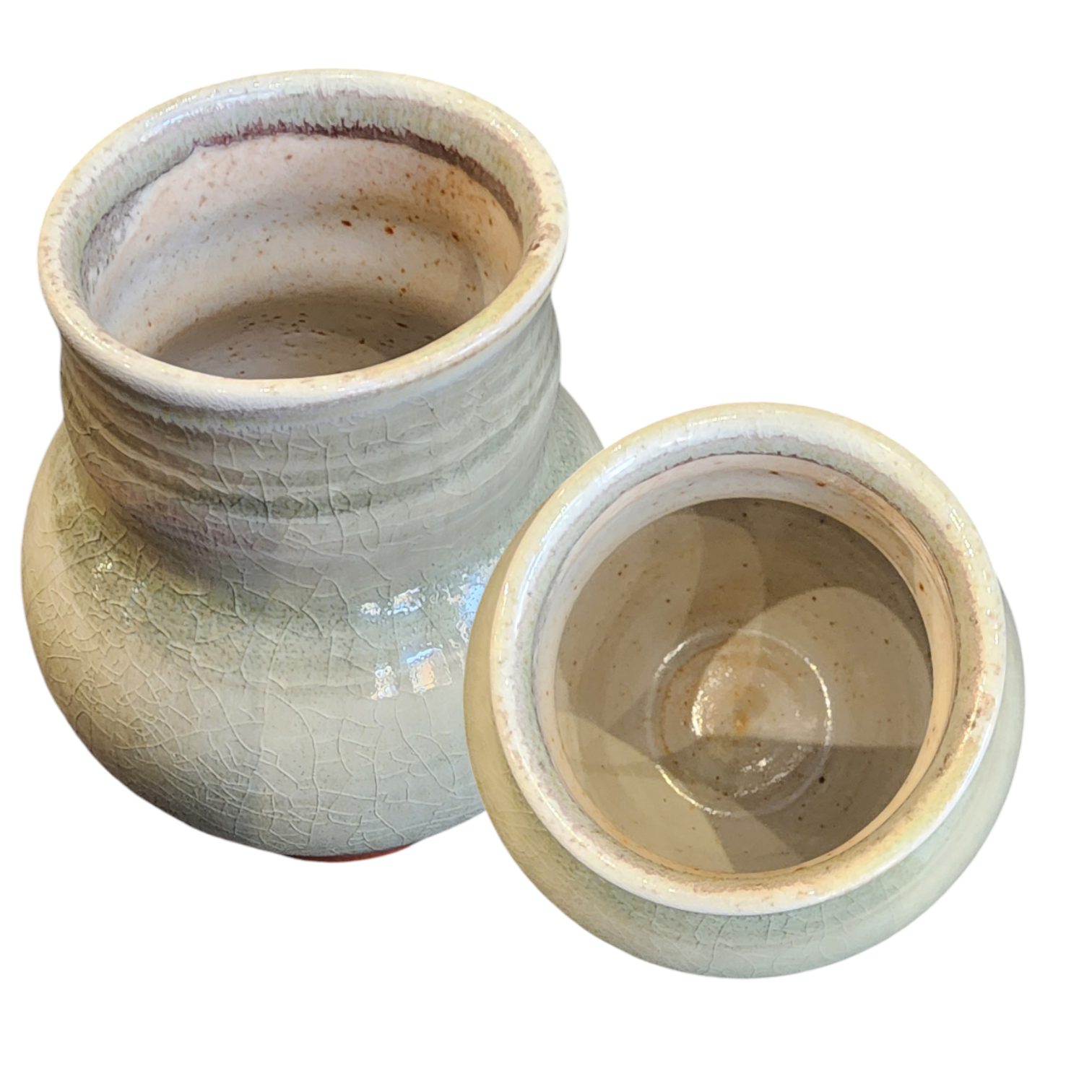 Soda firing - Atmospheric firing - gas and chemicals combined to make “soda’ produce the effects on the work. In this firing you can have beautiful results without glazing a piece. You can also use glaze to color your pots, but the introduction of soda yields to chemical reactions/combinations that yield the unpredictability of colors and patterns. Soda is added at intervals once kiln has reach 1800 degrees.