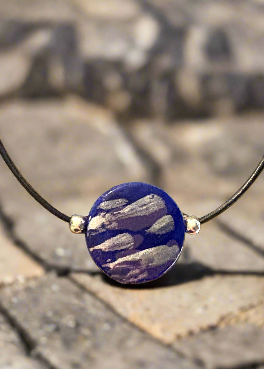 Materials: hand painted on a wooden bead, leather cord, stainless steel lever back earring hoop